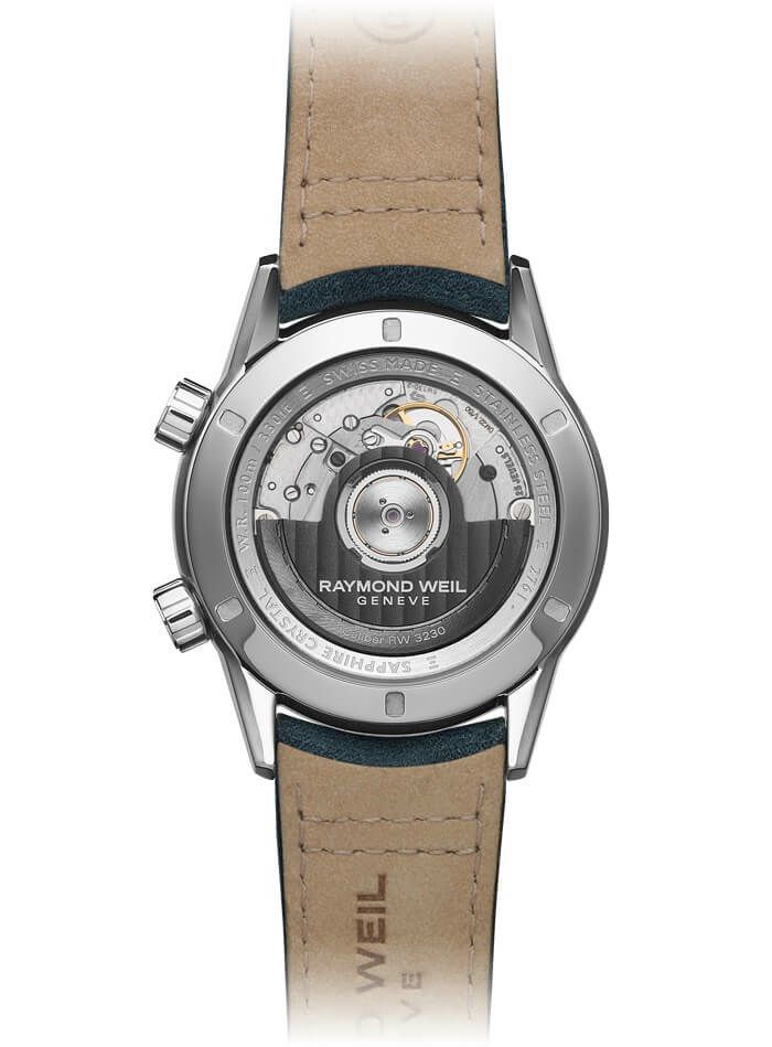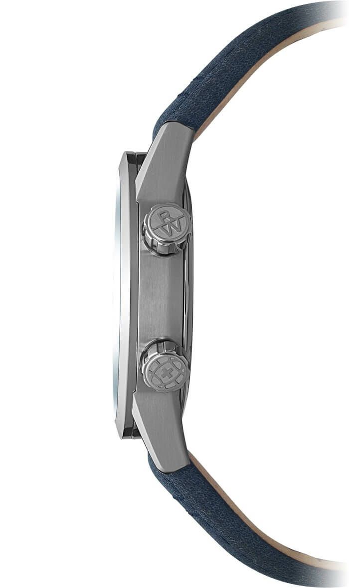 コレクション初となる40.5mm径ケースにGMT機能を備えた、ブルートーンのフリーランサーです。2時位置のリューズで時刻の調整、4時位置のリューズでGMT針の調整ができます。ダイアル外周部には24までの数字が記されており、昼間は明るいブルーの背景に黒文字、夜間は暗いブルーに白文字で、ホームタイムを表示します。3針・GMT針・インデックスにはスーパールミノバが塗布されており、夜間に発光することで視認性を高めます。約56時間のパワーリザーブを持つ厚さわずか4.1mmの、新作キャリバー・RW3230が搭載されています。