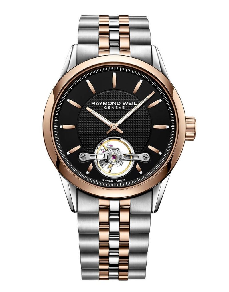レイモンド ウェイル専用キャリバー・RW1212 と、ローズゴールドPVD加工を施したベゼル・ブレスレットを備えたフリーランサーです。ブラックダイアルの6時位置のオープンハートからキャリバーの美しい動きを楽しむことができます。