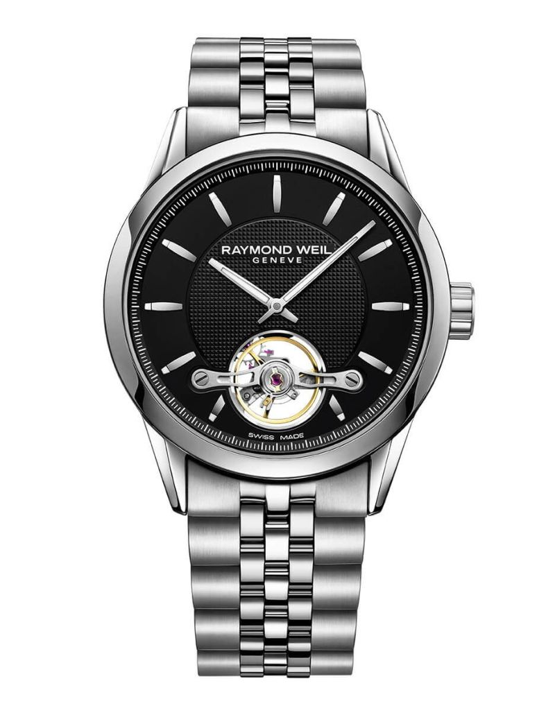 レイモンド ウェイル専用キャリバー・RW1212 、ブラックダイアル、ステンレススティール製ブレスレットを備えたフリーランサーのモデルです。6時位置のオープンハートからキャリバーの美しい動きを楽しむことができます。サファイアクリスタルの風防にはアンチグレア加工を施し、光の映り込みを抑制しています。