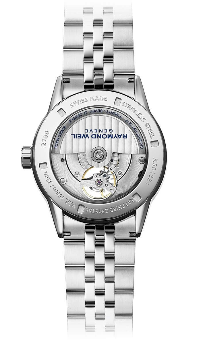 レイモンド ウェイル専用キャリバー・RW1212 、ブルーダイアル、ステンレススティール製ブレスレットを備えたフリーランサーのモデルです。6時位置のオープンハートからキャリバーの美しい動きを楽しむことができます。サファイアクリスタルの風防にはアンチグレア加工を施し、光の映り込みを抑制しています。