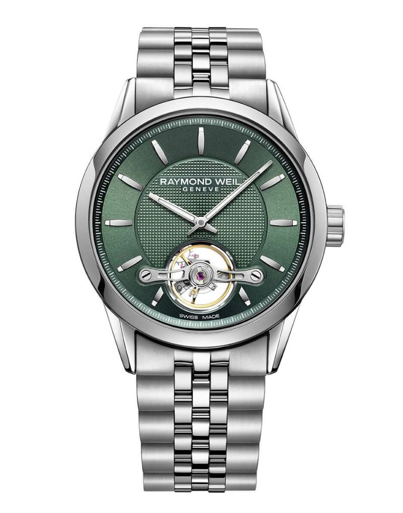 レイモンド ウェイル専用キャリバー・RW1212 、グリーンダイアル、ステンレススティール製ブレスレットを備えたフリーランサーのモデルです。6時位置のオープンハートからキャリバーの美しい動きを楽しむことができます。サファイアクリスタルの風防にはアンチグレア加工を施し、光の映り込みを抑制しています。