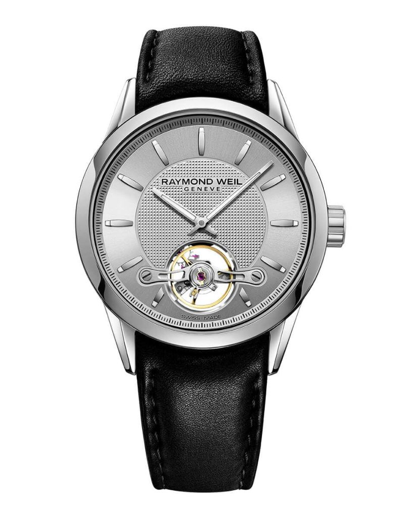レイモンド ウェイル専用キャリバー・RW1212 、シルバーダイアル、カーフレザーブレスレットを備えたフリーランサーのモデルです。6時位置のオープンハートからキャリバーの美しい動きを楽しむことができます。サファイアクリスタルの風防にはアンチグレア加工を施し、光の映り込みを抑制しています。