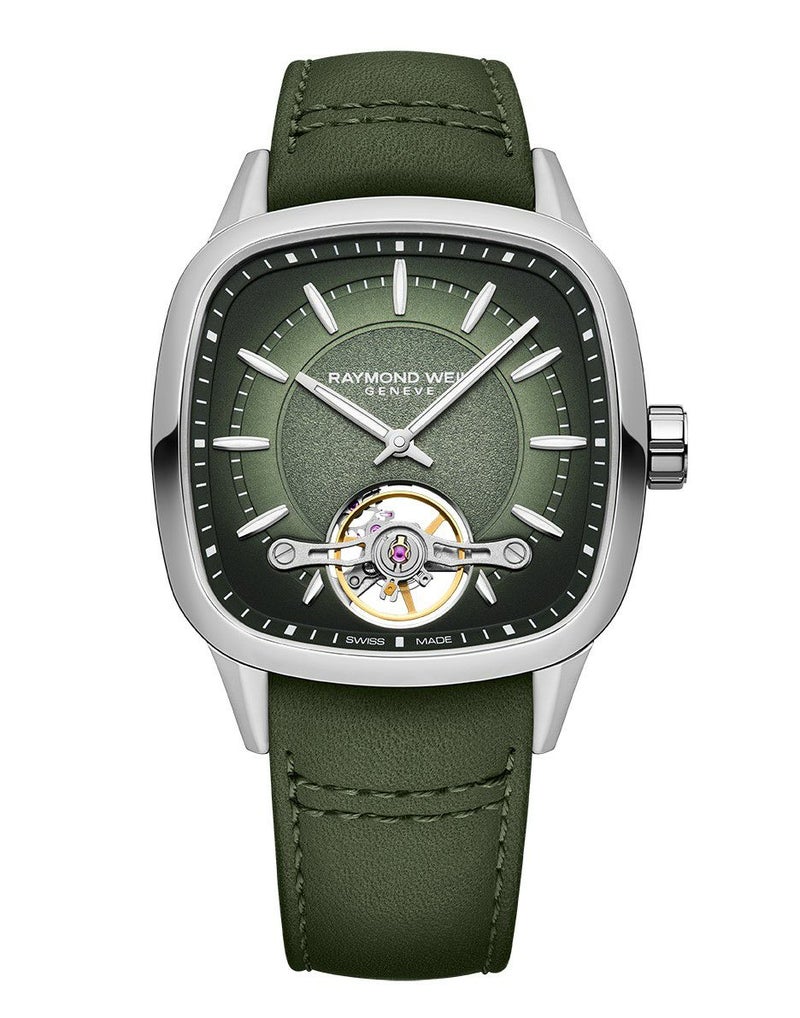 メンズ、自動巻き、40mm、グラデーショングリーンダイアル、レザーストラップ、オープンワーク