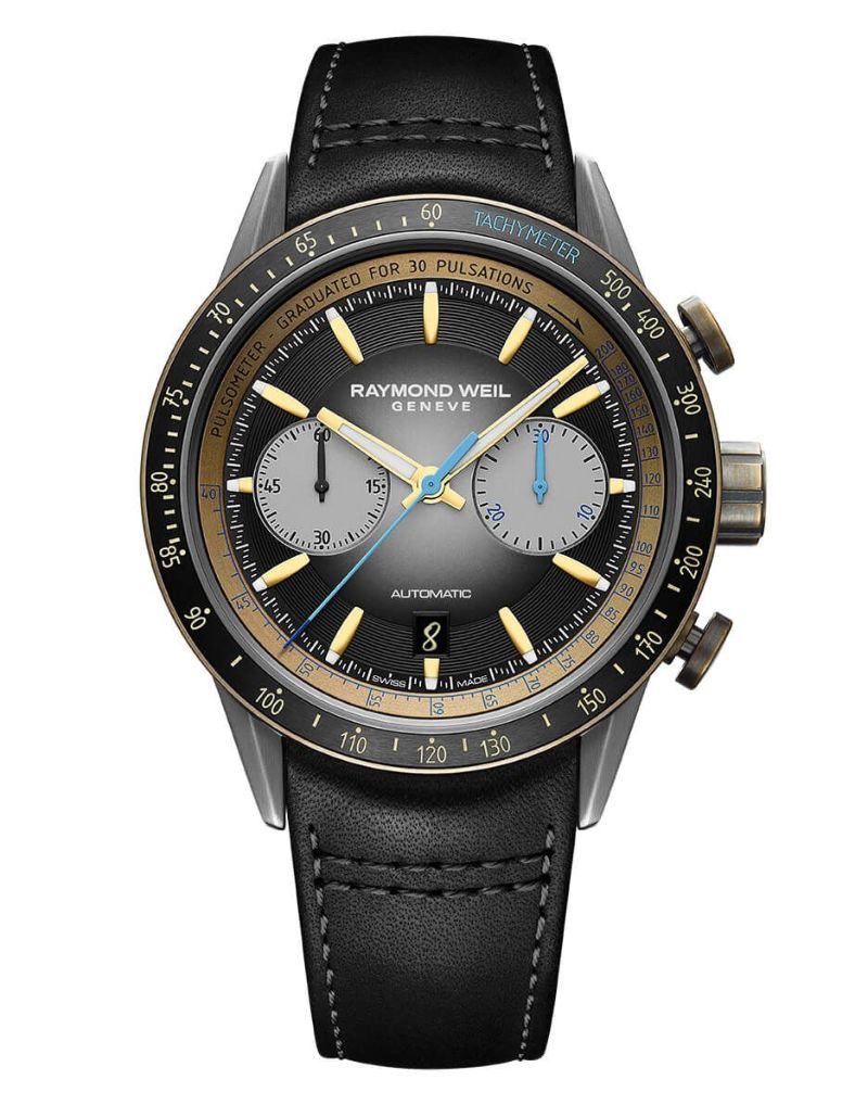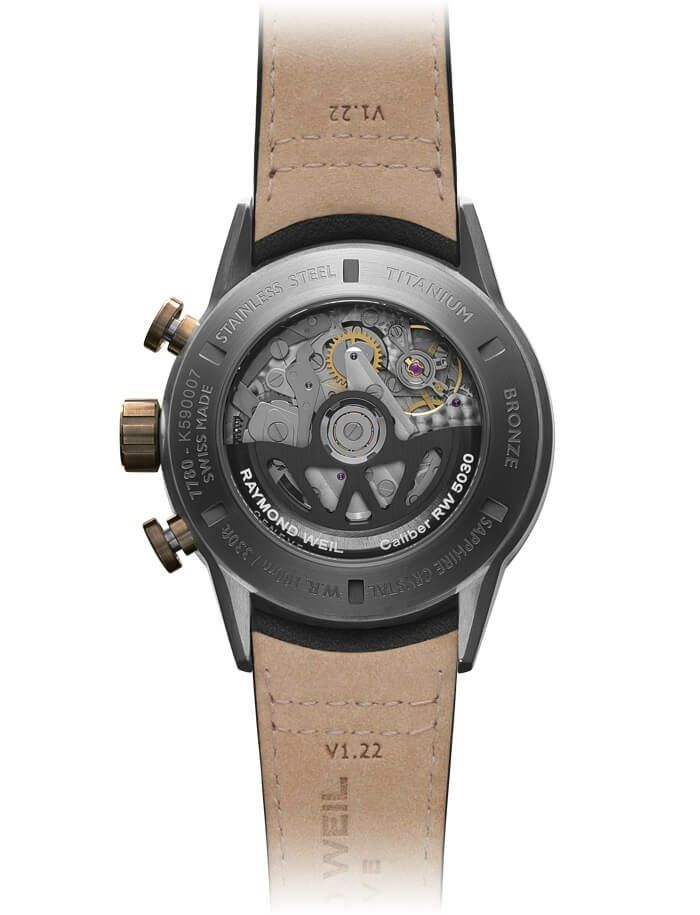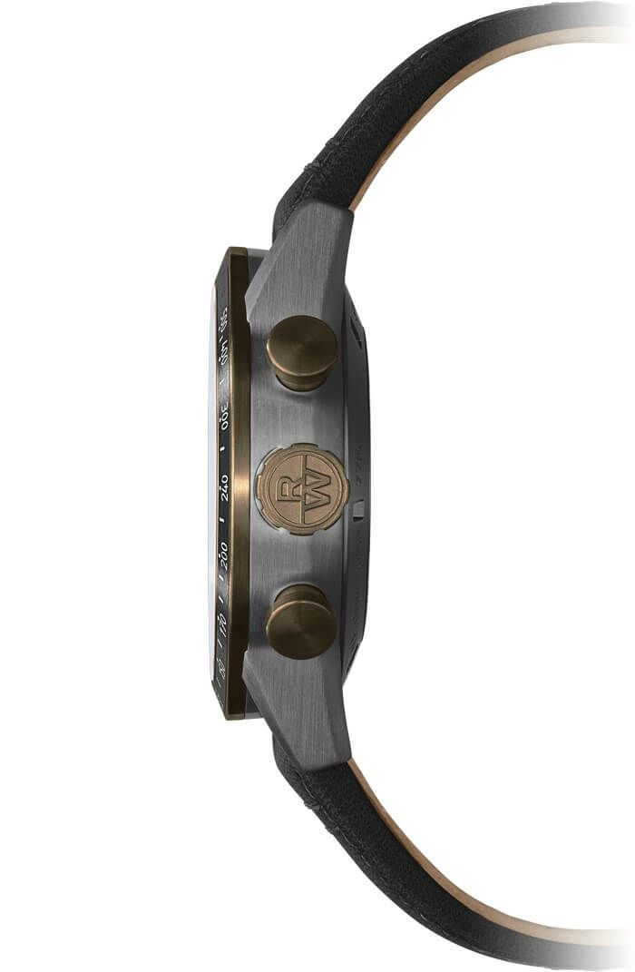 バイクにインスピレーションを受け誕生した、クロノブラフ機能付きのヴィンテージ風フリーランサーです。チタンとブロンズを複合したケース・セラミックベゼルに、約62時間のパワーリザーブ性能を持つ自動巻きキャリバー・RW5030を搭載し、スモールセコンドと30分積算計をバイクの2輪のタイヤのように設置しています。ベゼルのタキメーターでは、移動にかかった秒数から時速の測定ができ、ダイアル外周部のパルスメーターでは、30回の心拍にかかった秒数から心拍数を測定することができます。時針・分針・インデックスには発光性能があり、暗所での視認性を高めます。サファイアクリスタルの風防にはアンチグレア加工を施し、光の映り込みを抑制しています。