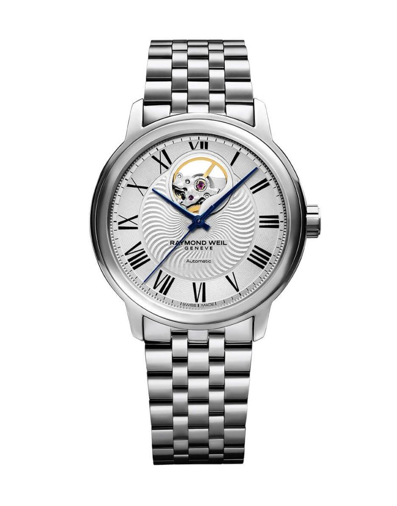 メンズ、自動巻き、39.5mm、シルバーダイアル、ローマ数字、ステンレススティールブレスレット、オープンワーク