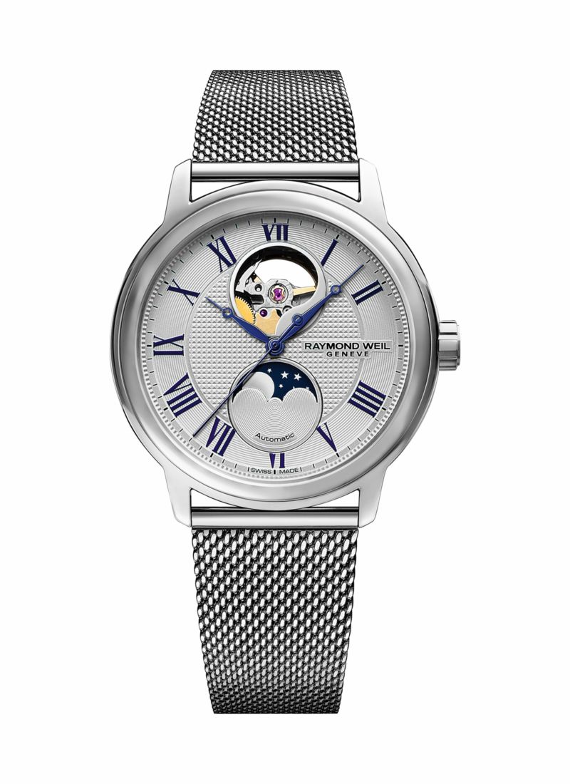 メンズ、自動巻き、39.5mm、シルバーダイアル、ローマ数字、ミラネーゼブレスレット、ムーンフェイズ機能、オープンワーク