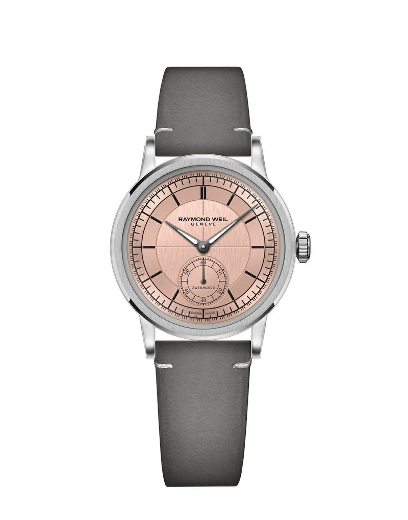 メンズ、自動巻き、35mm、サーモンピンクダイアル、レザーストラップ、スモールセコンド