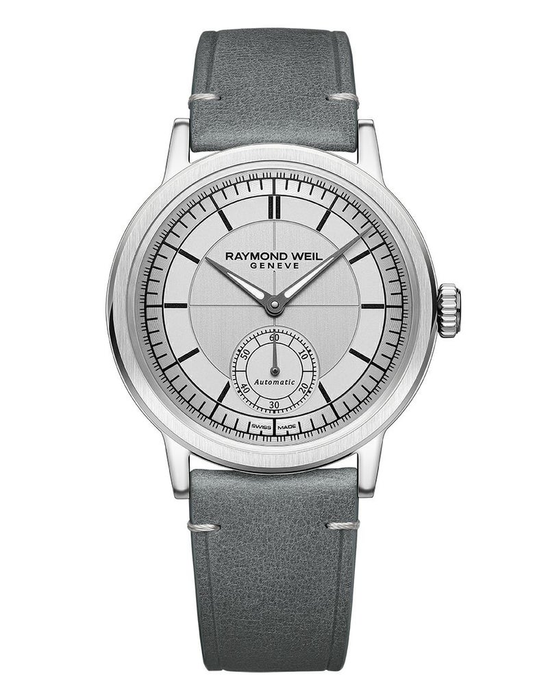 メンズ、自動巻き、39.5mm、シルバーダイアル、レザーストラップ、スモールセコンド
