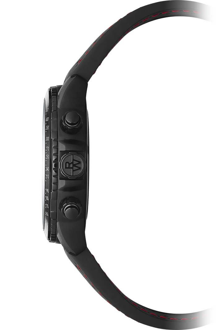 アルミニウム製のブラックベゼルにタキメーター機能を搭載しており、レッドがアクセントのブラックダイアルにはアラビア数字インデックスと3つのインダイアルを備えています。また、スイス製の高精度のクォーツムーブメントを使用しており、300mの防水性能を保持しています。