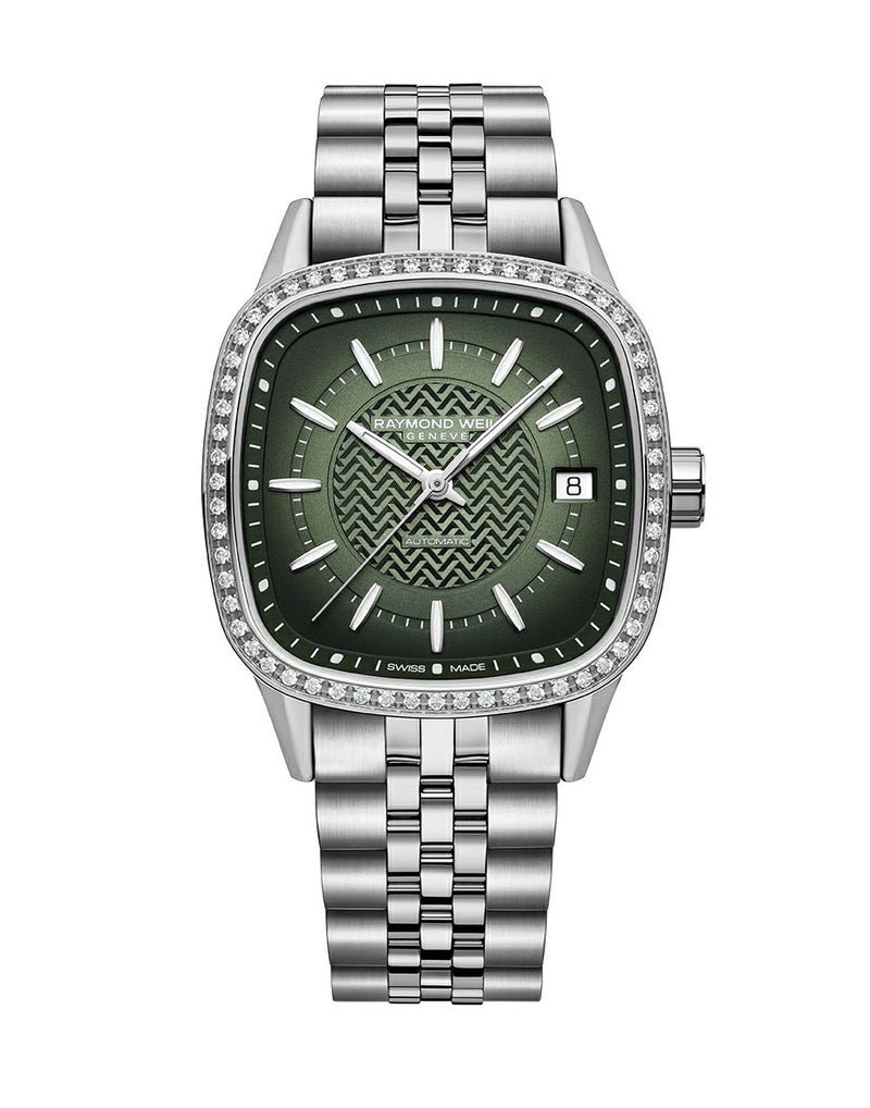 ウィメンズ、自動巻き、34.5mm、グラデーショングリーンダイアル、ステンレススティールブレスレット