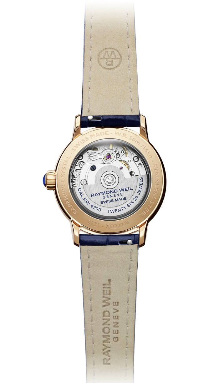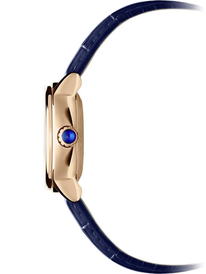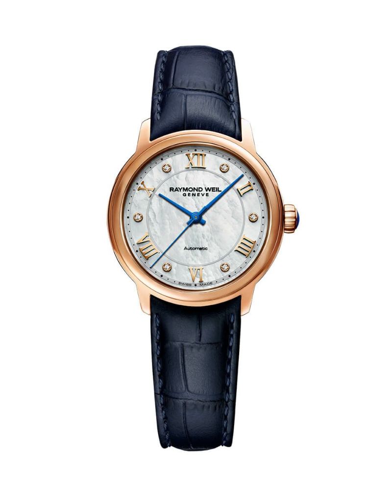 ローズゴールドPVD加工を施した31mmのステンレススティール製ケースに包まれた、ホワイトマザーオブパールのダイアルには、エレガントなローマ数字とダイアモンドがインデックスに用いられています。ロイヤルブルーの針が美しく時を刻む、優雅なタイムピースです。ストラップには、クロコ型押しカーフレザーを使用しています。