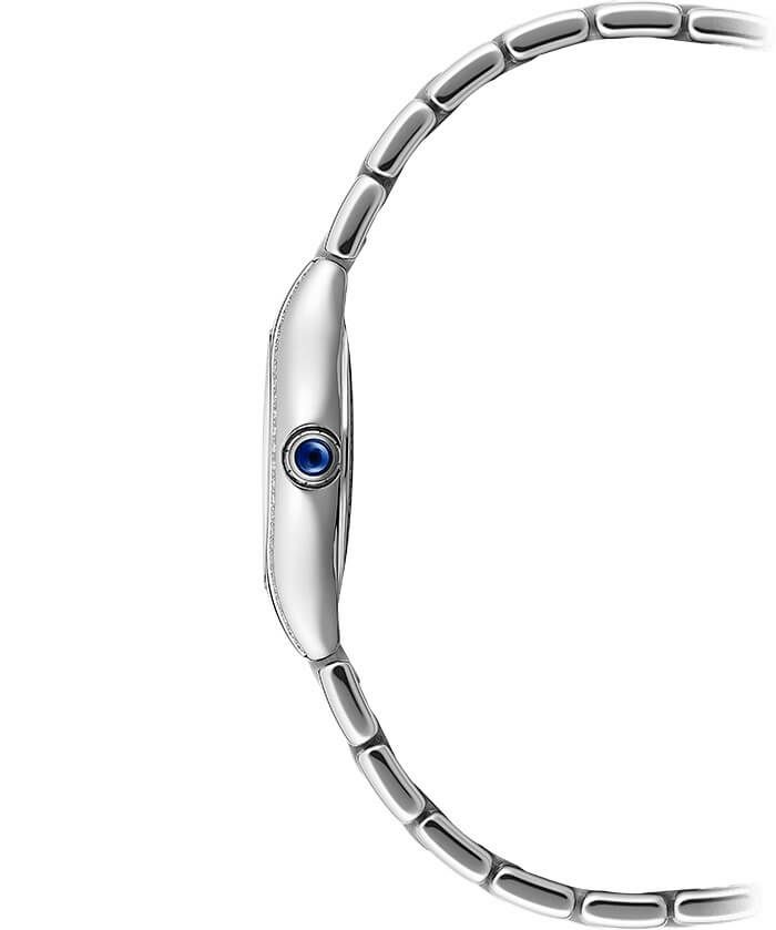 24mmのステンレススティール製ケースに包まれたホワイトマザーオブパールのダイアルには、10個のスパークリングダイヤモンドと12時位置・6時位置のローマ数字が、ベゼルには52個のダイアモンドが装飾されています。