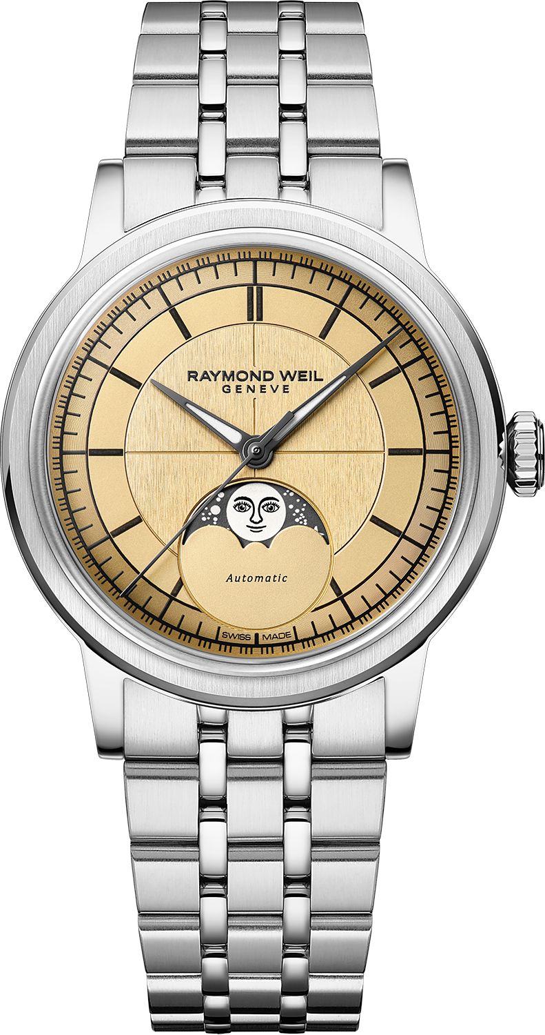 オールシーズン使えるステンレススティールブレスレットを装備。ケースと同じくヘアラインとポリッシュの仕上げを組み合わせた 5 連仕様で、手首に沿う快適なフィット感を提供。バックルにはレイモンド ウェイルのモノグラムを刻印しています。